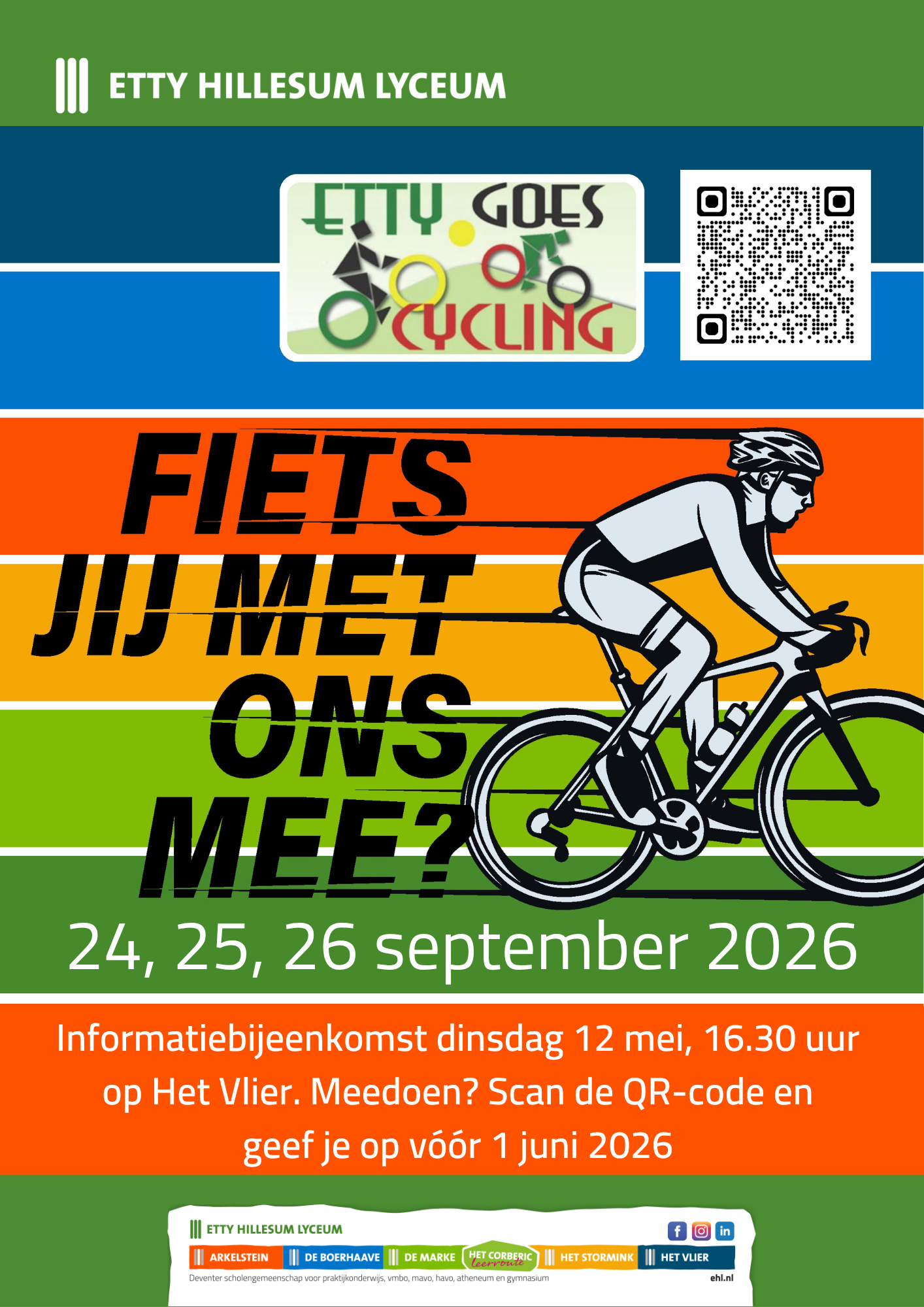 In de informatiebrief (die snel volgt) lees je meer over deze sponsorfietstocht. Enthousiast? Op 12 mei vindt er een informatiebijeenkomst plaats voor geïnteresseerde leerlingen, ouders en collega's. Jullie zijn van harte welkom om 16:30 uur. Ben je (al) zeker van je deelname? Geef je dan nu op via de formulieren die hier binnenkort geplaatst worden: inschrijfformulier deelname leerling of inschrijfformulier deelname ouder/verzorger/medewerker.